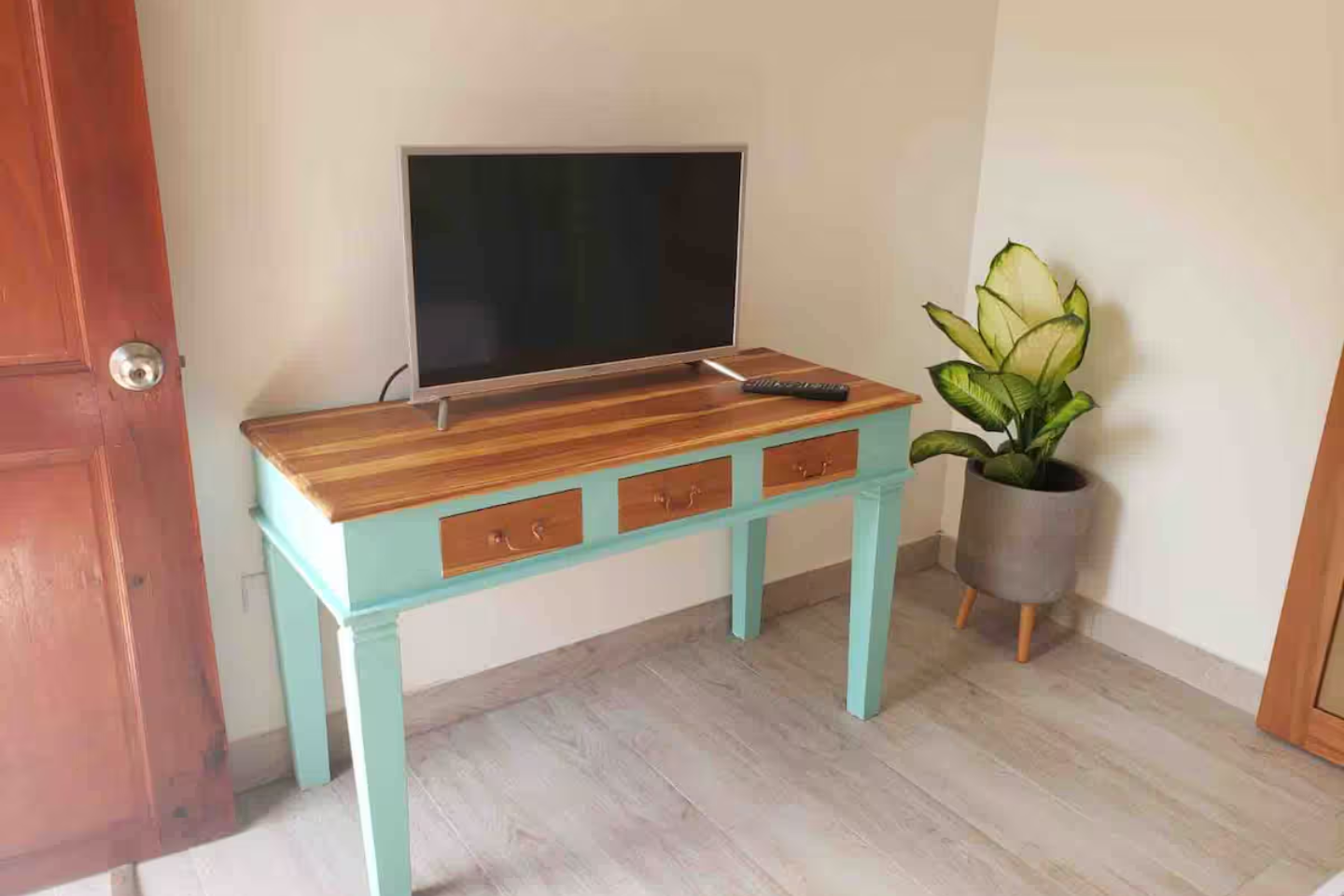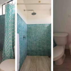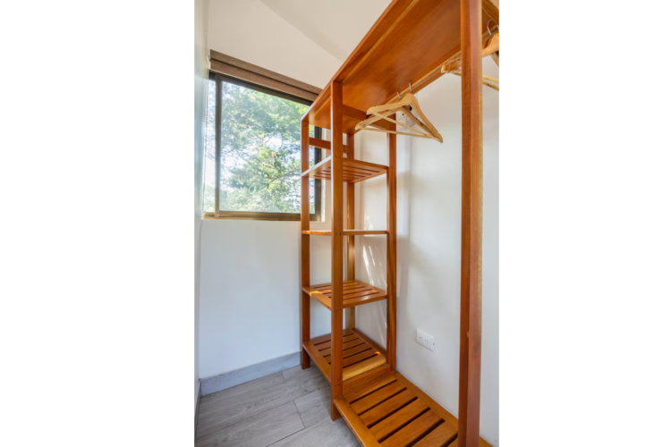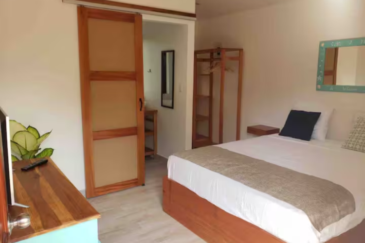 Ubicado arriba, cama queen, baño privado con ducha que incluye toallas limpias, ventilador de techo, aire acondicionado, wifi, un televisor inteligente y una pequeña nevera.