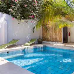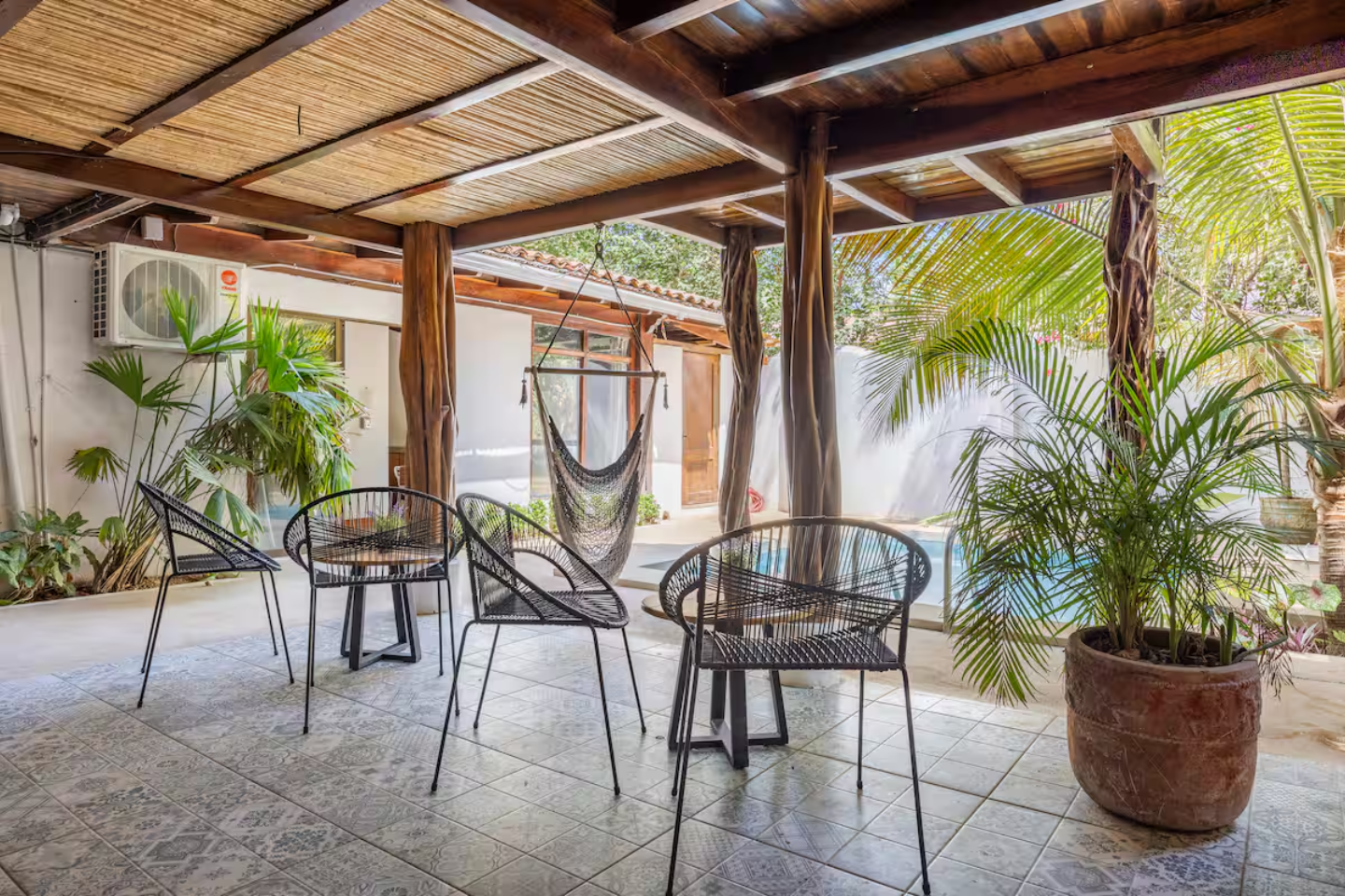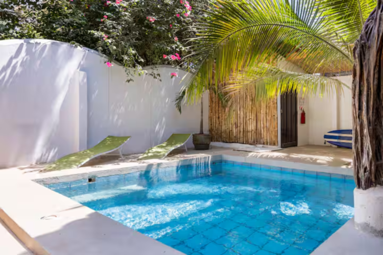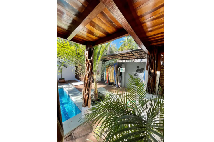 El área común incluye una piscina y una ducha al aire libre para enjuagar. Wi-Fi gratis